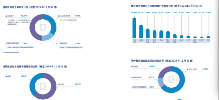 经济观察报发现,与此前大比例配置股票不同,中投公司另类资产占固定收益类资产比不断提升。数据显示,截至2024年底,中投公司持有的包括对冲基金、泛行业私募股权、私募信用、房地产、基础设施、资源商品等资产在内另类资产占比达48.49%,是占比规模最高的一类资产;公开市场股票占比34.65%,包括国债、公司债等债券产品在内的固定收益类资产占比则为15.53%,现金类产品占比1.33%。而在2023年,中投公司公开市场股票、固定收益资产、另类资产和现金类资产占比分别为33.13%、16.46%、48.31%以及2.1%。而在更早的时间里,中投公司则更偏重股票投资,以2019年为例,公司公开市场股票投资和另类投资的占比分别为38.9%以及42.2%,彼时年化净投资收益率高达17.41%。